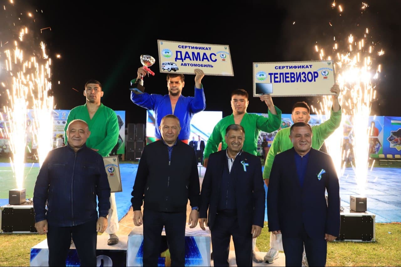Мутлоқ вазн тоифаларида фахрли биринчи ўринни қўлга киритган кураш бўйича Яҳё Имомов ҳамда белбоғли кураш бўйича Нодир Аҳатжоновга бош соврин – “Дамас” автомобили топширилди.