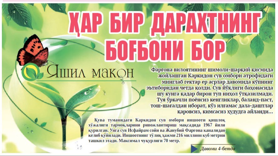 — “Яшил макон” умуммиллий лойиҳасининг бу йилги баҳор ва куз мавсумида вилоятимизда 15,2 миллион туп манзарали, мевали дарахт ва бута кўчати экиш режалаштирилган, — дейди Фарғона вилояти экология, атроф-муҳитни муҳофаза қилиш ва иқлим ўзгариши бошқармаси бошлиғи Баҳромжон Жуманов. — Экилган кўчатлар тегишлилиги бўйича ер эгалари томонидан муҳофаза қилинади. Ниҳоллар қуриб қолишининг олдини олиш, озиқлантириш, суғориш, турли касалликларга қарши кимёвий ишлов бериш ва парваришлашга масъуллар бириктирилмоқда. Кейинги уч йилда Фарғона вилоятида 45 миллион туп кўчат ва бута экилиб, яшиллик даражаси 38 фоиздан ошди. Яқин истиқболда бу боғлар ҳудудида аҳоли учун ҳордиқ чиқаришга мўлжалланган яшил табиат масканлари бунёд этиш мақсад қилинган. Бундан ташқари, 17 та чиқинди полигони атрофида терак ва тол кўчатлари экилиб, махсус иҳотазорлар барпо этишга алоҳида эътибор бериляпти.