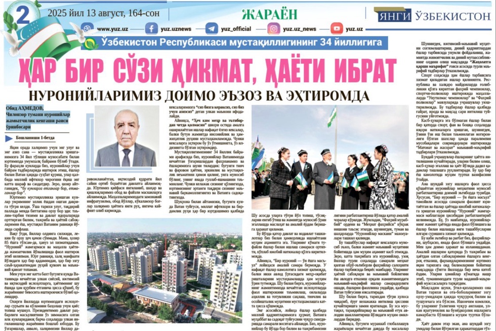 Яқин орада халқимиз учун энг улуғ ва энг азиз сана — мустақилликка эришга­нимизга 34 йил тўлиши муносабати билан юртимизда умумхалқ байрами бўлиб ўтади. Бу фараҳли кунларда биз, нуронийлар учун байрам тадбирларида иштирок этиш, ёшлар билан Ватан ҳақида суҳбат қуриш, улар қал­бида миллий ифтихор чироғини ёқиш энг катта шараф ва саодатдир. Зеро, шоир айт­ганидек, “бу кунларга етганлар бор, етма­ганлар бор”.