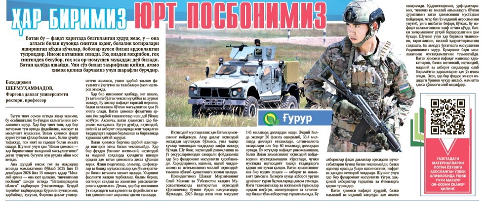 Ана шундай юксак ғоя ва мақсадлар асосида мамлакатимиз бўйлаб 2025 йил 15 декабрдан 2026 йил 15 январга қадар “Миллий армия — она юрт қалқони, тинчлигимиз посбони” шиори остида “Ватанпарварлик ойлиги” тадбирлари ўтказилмоқда. Бундай тарғибот тадбирларида Қуролли кучларимиз, ҳарбийлар, хусусан, Фарғона давлат университети жамоаси, унинг ҳарбий таълим факультети ўқитувчи ва талабалари фаол иштирок этмоқда.
