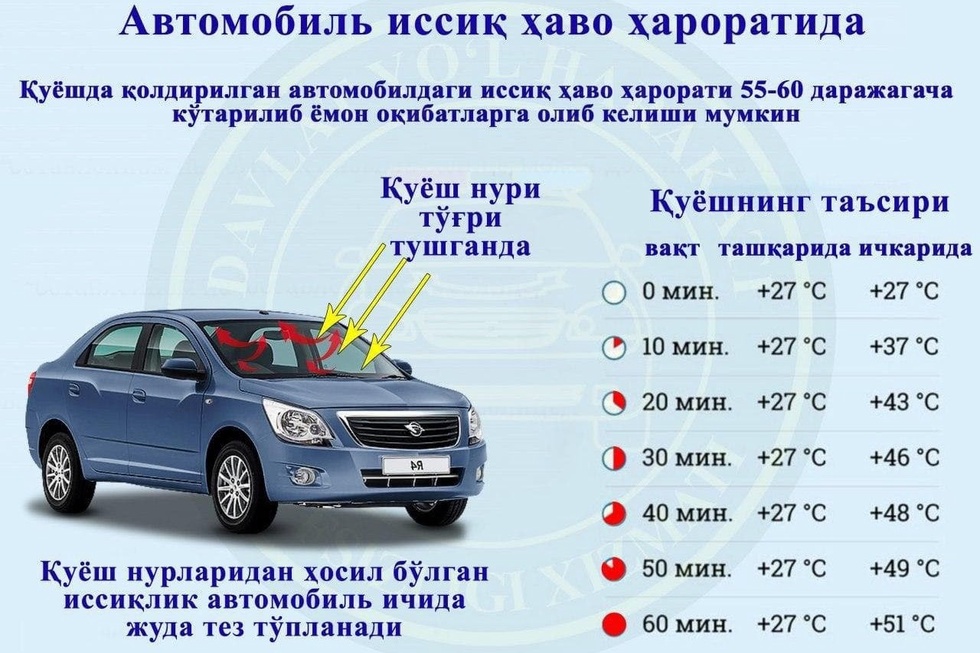 Айни кунларда ҳаво ҳароратининг кўтарилиши сабабли транспорт воситасини соя ва салқин жойларда қолдиришингизни сўралди.