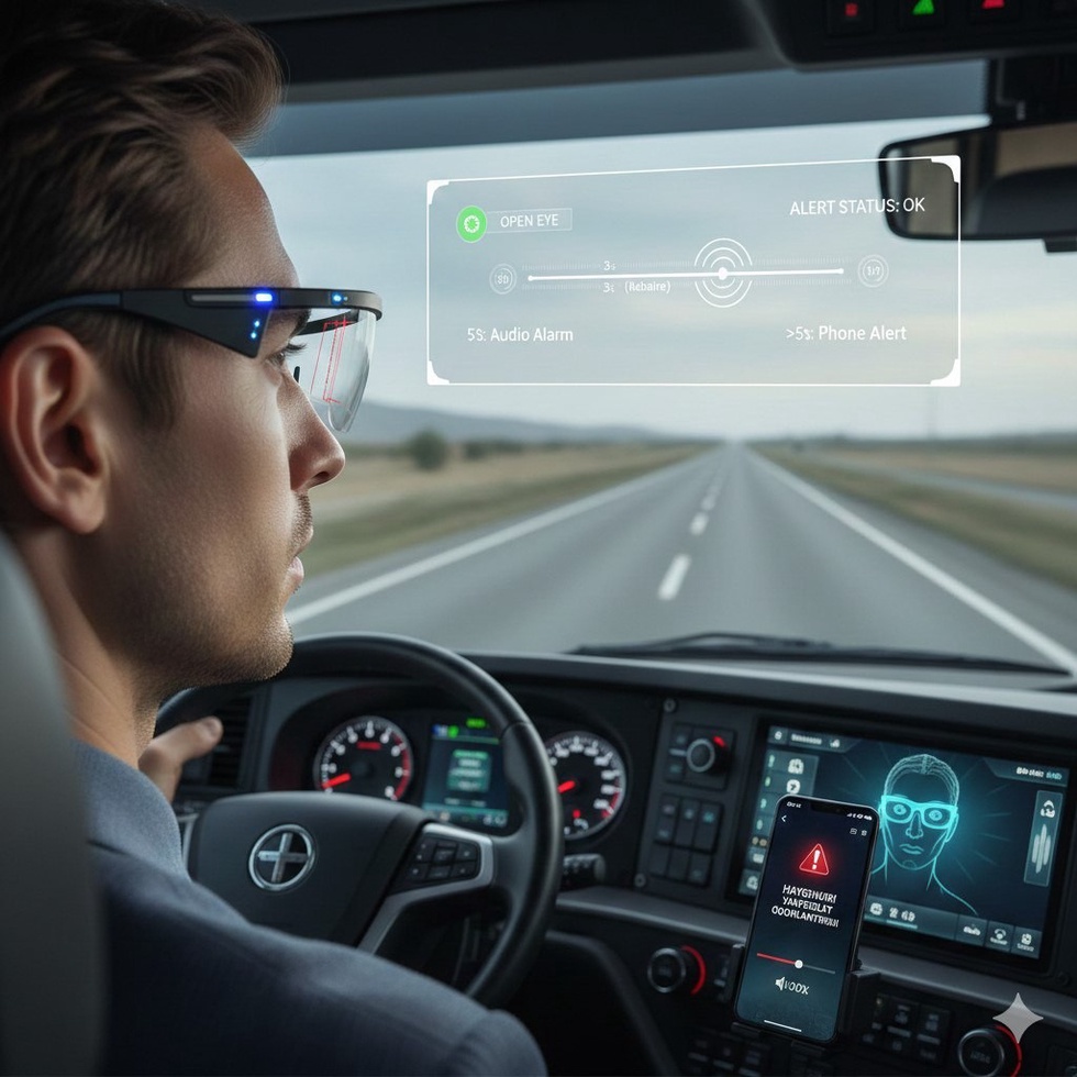 Кўзойнак рамкасига ўрнатилган оптик сенсорлар реал вақт режимида ҳайдовчининг кўз ҳолатини мониторинг қилади.