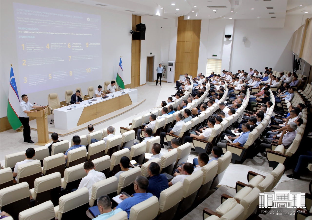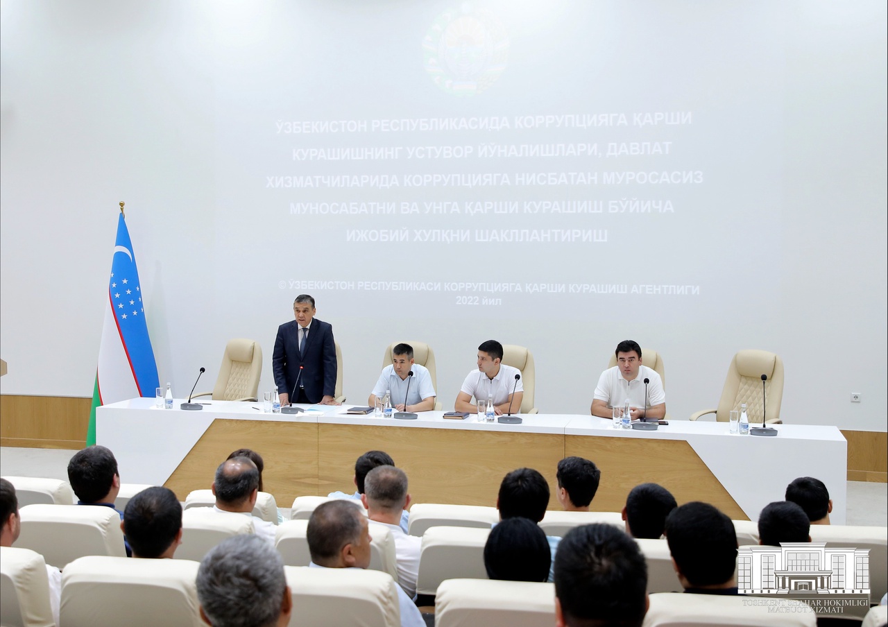 Шунга мувофиқ, жорий йилнинг 20 июнь санасидан эътиборан мамлакатимиз ҳудудларида “Ўзбекистон Республикасида коррупцияга қарши курашишнинг устувор йўналишлари, давлат хизматчиларида коррупцияга нисбатан муросасиз муносабатни ва унга қарши курашиш бўйича ижобий хулқни шакллантириш” мавзусидаги семинар машғулотлари бошланди.