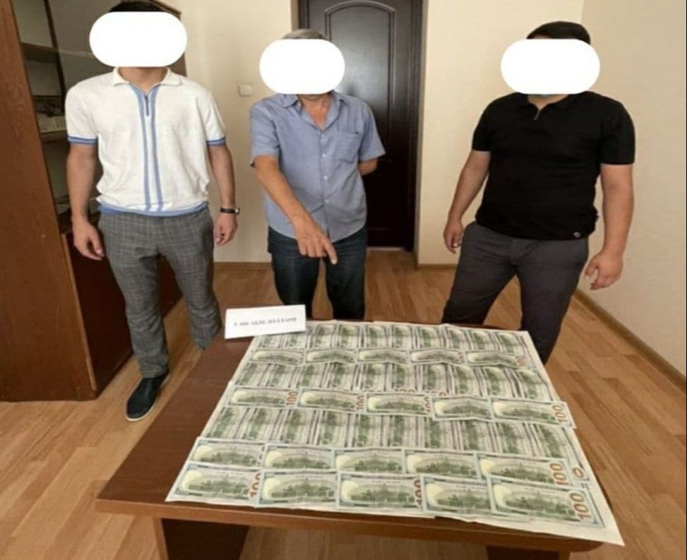 У олдиндан 5 000 АҚШ долларини олган вақтида ушланган, унинг кўрсатувига асосан давом этган тадбирда, шериклари М.А. ва Р.Т.лар юқори лавозимда ишловчи танишлари орқали ер майдони ҳужжатларини расмийлаштириб беришни ваъда қилиб, О.А.дан 5 000 АҚШ долларини олган вақтида ашёвий далиллар билан ушланганлар.