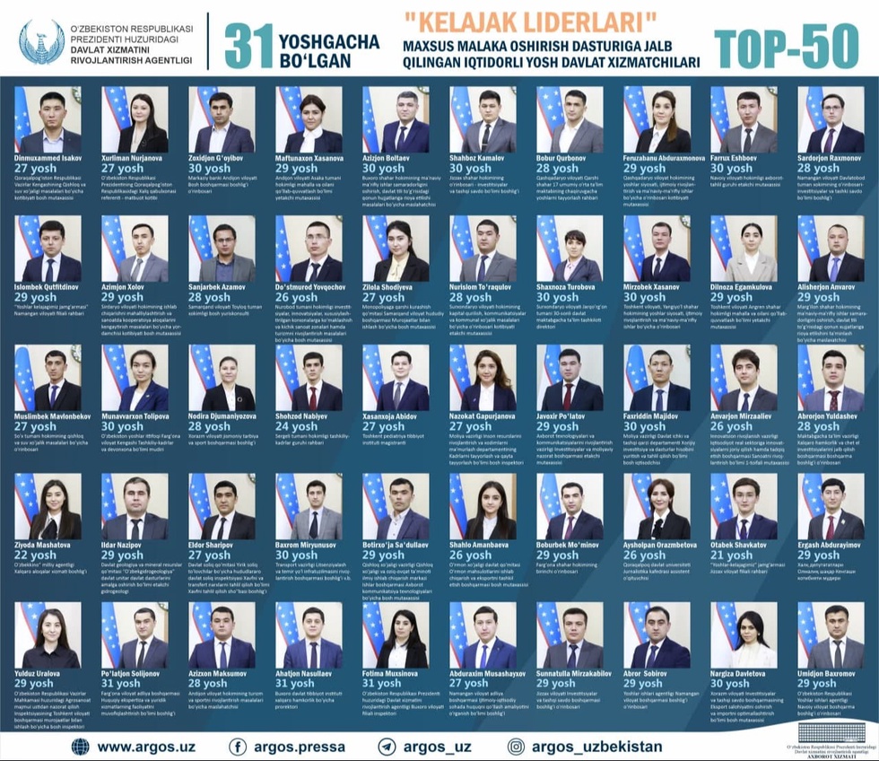 Куни-кеча Давлат бошқаруви академиясида дастурнинг очилиш маросими бўлди. Илк босқичга 21-31 ёшдаги давлат органлари ва ташкилотларида фаолият юритаётган ўрта бўғин раҳбар ва ходимлари жалб қилинди.