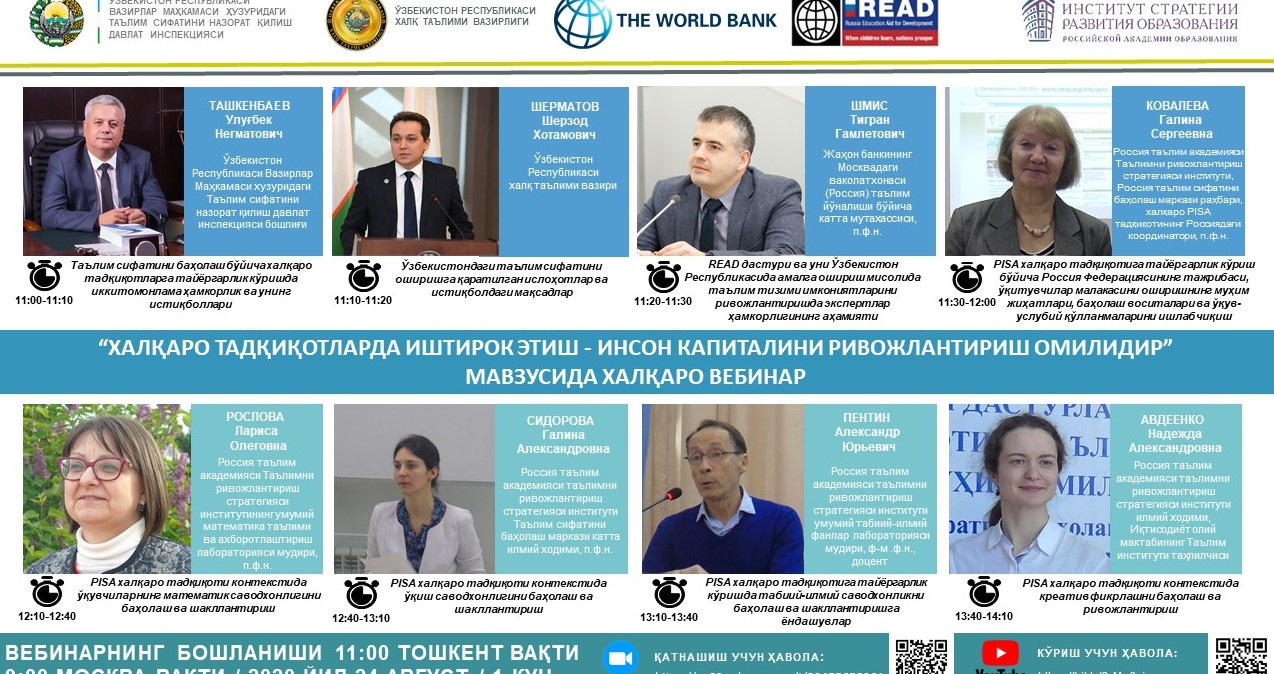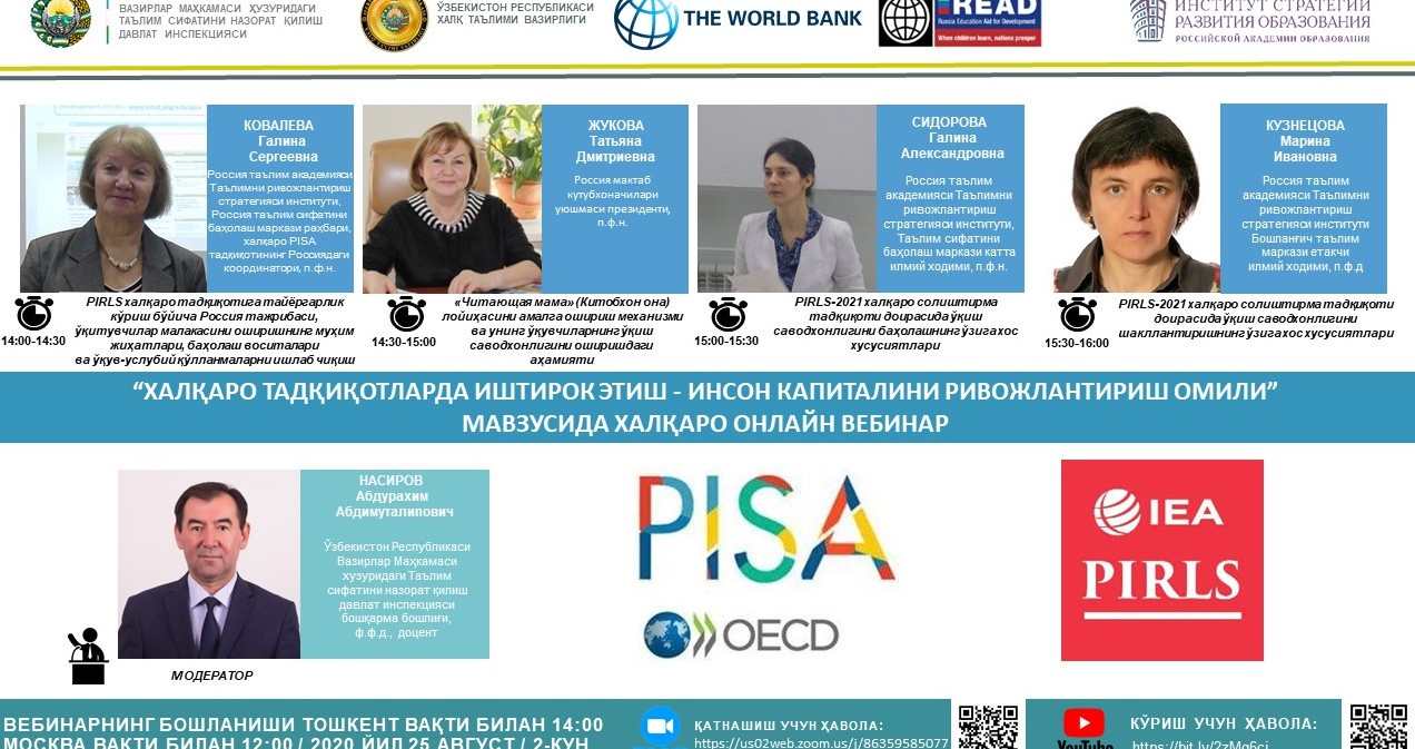 Икки кун давом этадиган ушбу вебинарда ўқувчиларнинг ўқиш, математик, табиий-илмий саводхонлиги ва креатив фикрлаш ҳамда матнни ўқиб тушуниш даражаларини баҳолаш ва ривожлантириш омиллари, таълим тизимидаги ўзгариб бораётган ёндашувлар ҳақида россиялик кўп йиллик тажриба эга халқаро экспертлар томонидан қимматли маълумотлар бериб ўтилиши кўзда тутилган.