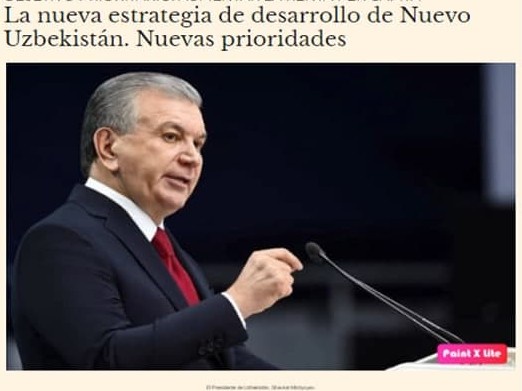 «Инсон қадри учун» тамойилига асосан ишлаб чиқилган етти устувор йўналиш инсон шаъни ва қадр-қимматини ҳурмат қилиш орқали инсонпарвар давлат яратиш ва эркин фуқаролик жамиятини янада ривожлантириш, адолат ва қонун устуворлиги тамойилларини мамлакат тараққиётининг асосий ва зарур шартига айлантириш, миллий иқтисодиётни ривожлантириш, унинг ўсиш суръатларини замон талаблари даражасида таъминлаш, адолатли ижтимоий сиёсат юритиш, инсон капиталини ривожлантириш, маънавий тараққиётни таъминлаш, тубдан ислоҳ қилиш ва бу соҳани янги босқичга кўтариш, умумбашарий муаммоларни миллий манфаатлар асосида ҳал этиш, мамлакат хавфсизлиги ва мудофаа салоҳиятини мустаҳкамлаш, очиқ ва прагматик, фаол ташқи сиёсат олиб бориш мақсадларини қамраб олган», — деб ёзади испан нашри.