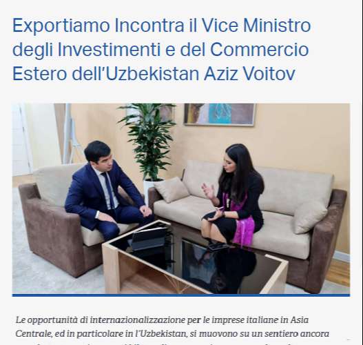 «Италия Ўзбекистон товар ва хизматлар бозорига фаол кириш имкониятига эга. Италиялик ишлаб чиқарувчилар ва экспортчилар Ўзбекистон бозорида ўз товар ва хизматларини илгари суришнинг янги имкониятларини кашф қилиши мумкин. Ўз навбатида, Ўзбекистоннинг Жаҳон савдо ташкилотига аъзо бўлишию Кенгайтрилган шериклик ва ҳамкорлик битимининг имзоланиши италиялик истеъмолчилар учун ўзбек тўқимачилик, мева-сабзавот маҳсулотлари, бошқа юқори сифатли товарларини харид қилиш истиқболларини очади», - дея қайд этилади суҳбатда.