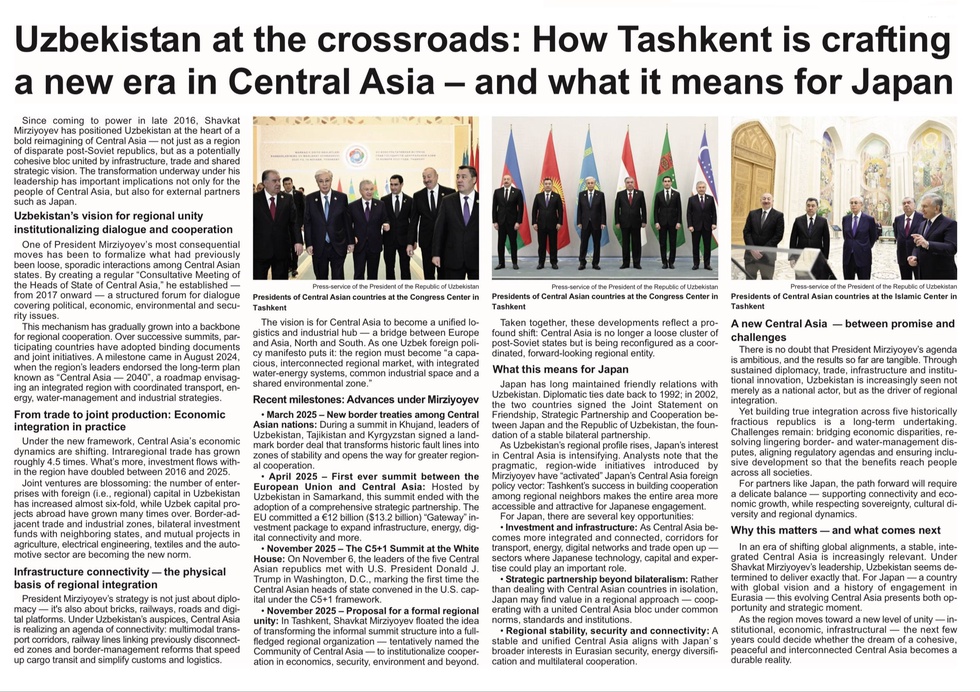 Шу билан бирга, мақолада Япония каби ташқи ҳамкорлар учун ушбу жараёнлар янги стратегик имкониятлар очаётгани, интеграциялашиб бораётган Марказий Осиё хорижий инвестициялар, технологиялар ва инфратузилмавий ҳамкорлик учун янада жозибадор маконга айланаётгани эътироф этилади.