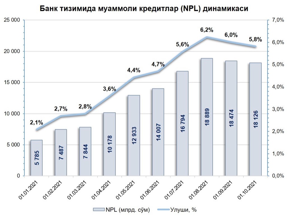 Банк тизимида муаммоли кредитлар (NPL) улуши жорий йилнинг июль ойида энг юқори даража 6,2 фоизга етган эди.