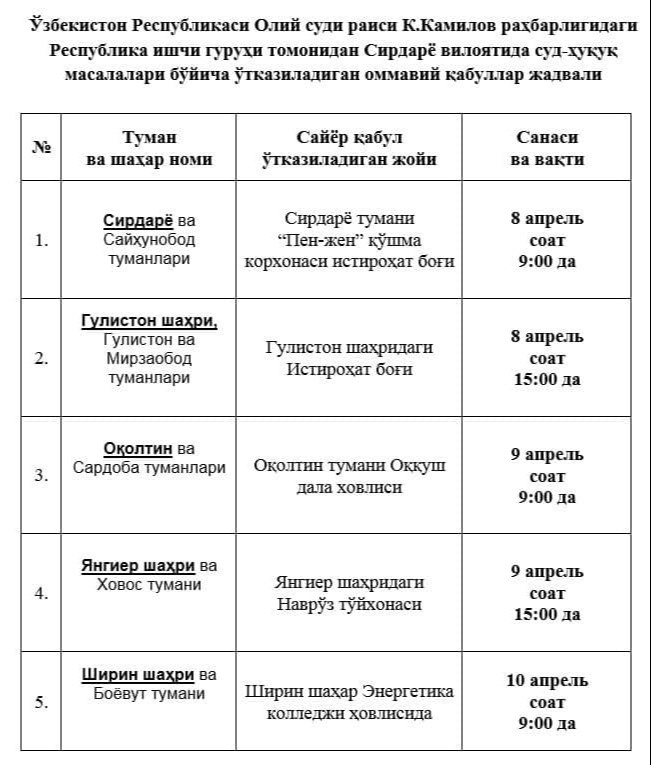 Ўзбекистон Республикаси Президенти маслаҳатчисининг биринчи ўринбосари Бахтиёр Исламов раҳбарлигидаги ишчи гуруҳи Жиззах вилоятида, Олий суд раиси Козимжон Камилов раҳбарлигидаги ишчи гуруҳи эса Сирдарё вилоятида 8 – 10 апрель кунлари иш олиб боради.