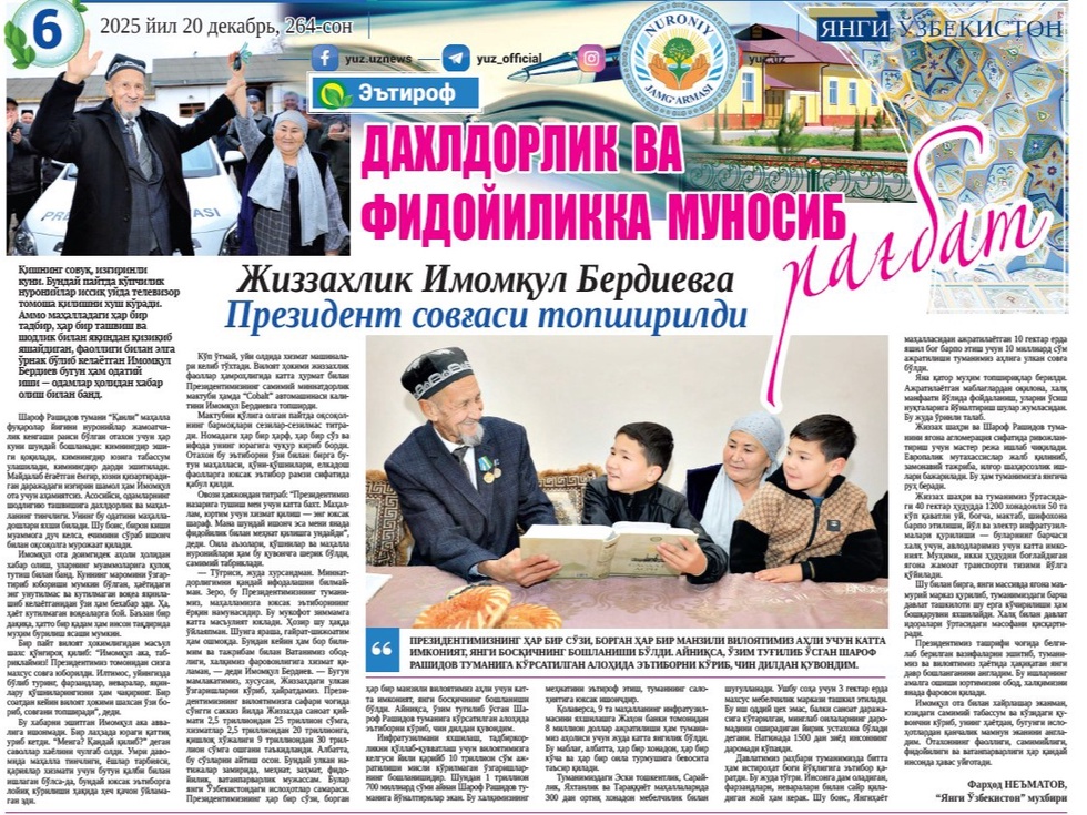Кўп ўтмай, уйи олдида хизмат машиналари келиб тўхтади. Вилоят ҳокими жиззахлик фаоллар ҳамроҳлигида катта ҳурмат билан Президентимизнинг самимий миннатдорлик мактуби ҳамда “Сobalt” автомашинаси калитини Имомқул Бердиевга топширди.