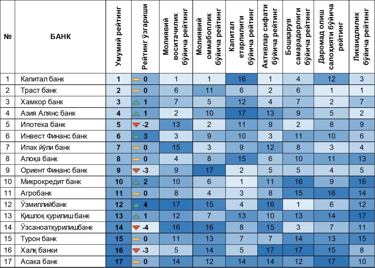 "Миллий банк" умумий рейтингда 4 поғонага (12 ўрин) юқорилади. Банкнинг бошқарув самарадорлиги ва ликвидлилик бўйича ижобий натижалар қайд кузатилди.