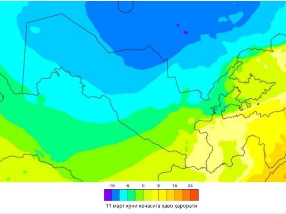 10-12 март кунлари ҳаво ҳарорати: республика шимолида кечалари 7-10 даража совуққача, кундуз кунлари 0-3 даража совуққача, қолган ҳудудларда 11-12 мартда: кечалари 0-3 даража совуққача, кундуз кунлари 2-5 даража илиққача пасаяди.