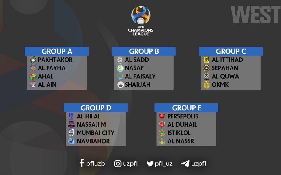 Ўзбекистоннинг “Пахтакор”, “Насаф”, “Навбаҳор” ва АГМК футбол клублари ОЧЛнинг 2023/2024 йилги мавсуми гуруҳ босқичидаги рақиблари номини билиб олди. АГМК таркибига Карим Бенземани қўшиб олган “Ал-Иттиҳод” билан, “Навбаҳор” эса Неймар билан шартнома тузган “Ал-Ҳилол” билан ўйнайдиган бўлди, деб хабар беради sport-platforma.uz.