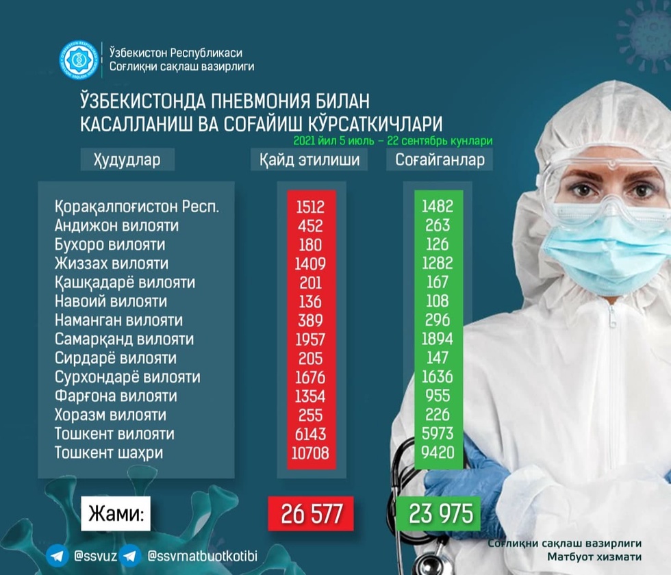 Юқоридаги жадвалда пневмония қайд этилиши ва ушбу касалликдан соғайиш кўрсаткичлари вилоятлар кесимида келтирилган.