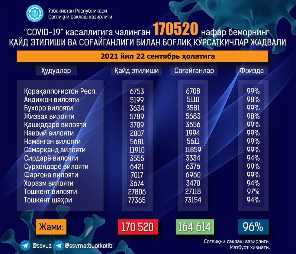 Тошкент шаҳрида 338 нафар бемор тузалиб, касалликдан соғайганлар жами 164614 (+629) нафарга етди ва соғайиш кўрсаткичи 96 фоизни ташкил этмоқда.