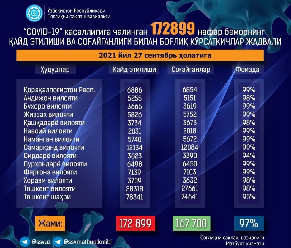 Тошкент шаҳрида 171 нафар бемор тузалиб, касалликдан соғайганлар жами 167700 (+501) нафарга етди ва соғайиш кўрсаткичи 97 фоизни ташкил этмоқда.