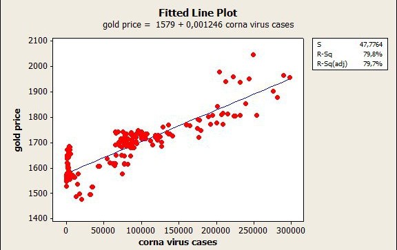 Олтин нархи ва кунлик касалланишлар сонини бир нечта модель орқали боғлаб кўришга ҳаракат қилдим. Аммо энг ишончли модель (ёки тенглама) чизиқли модель экан. Бу икки ўзгарувчи чизиқли модель орқали боғланганда, кунлик касалланишлар сони олтин нархи ўзгаришини 79.8% га тушунтириб берар экан. Бу шуни англатадики, кунлик касалланишлар сонининг ошиши ёки камайиши деярли 80 фоиз ҳолатларда олтин нархи ўзгаришига сабаб бўлар экан. Кунлик касалланишлар сони умуман мавжуд бўлмаган ҳолатда олтиннинг нархи унцияси учун ўртача 1579-доллар атрофида шакланар экан. Агар кунлик касалланишлар сони 1000 тага ошса бу олтин нархининг ўртача 1.24-доллар ошишига олиб келар экан. Табиийки, касалланишлар сонининг 1000 тага камайиши олтин нархининг ўртача 1.24 долларга пасайишига сабаб бўлиши мумкин(модель бўйича).