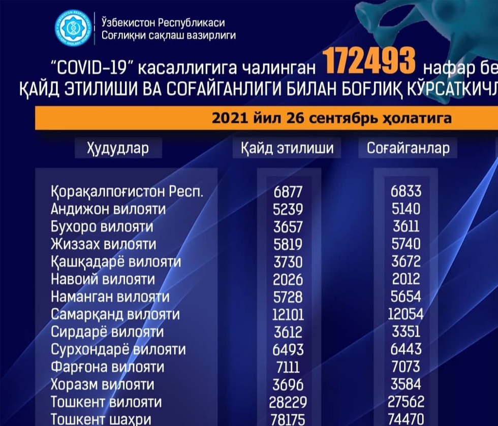 Тошкент шаҳрида 123 нафар бемор тузалиб, касалликдан соғайганлар жами 167199 (+418) нафарга етди ва соғайиш кўрсаткичи 97 фоизни ташкил этмоқда.