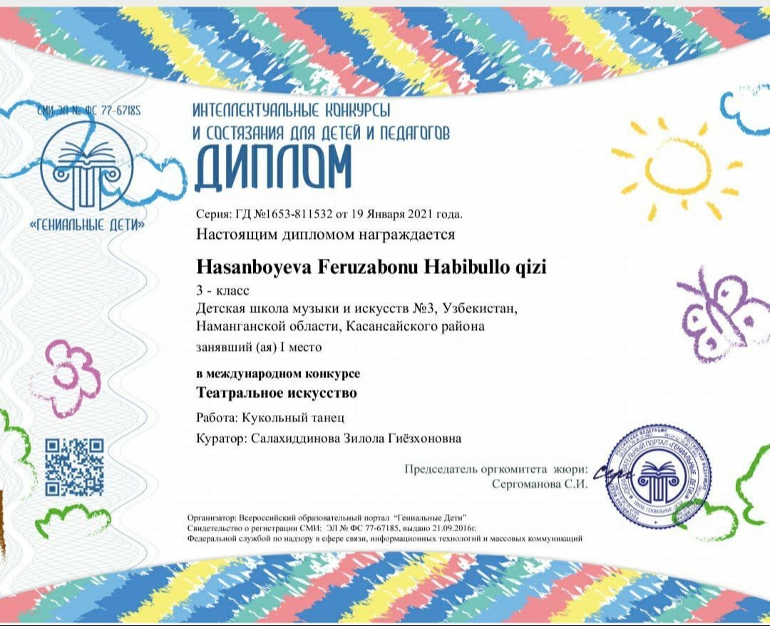 Жумладан, Косонсой туманидаги 3-сонли болалар мусиқа ва санъат мактабининг театр санъати йўналиши 3-синф ўқувчиси Ферузабону Ҳасанбоева яқинда Россия Федерацияси давлатида ўтказилган “Гениальние дети” онлайн танловида иштирок этиб, 1-ўринни қўлга киритди.