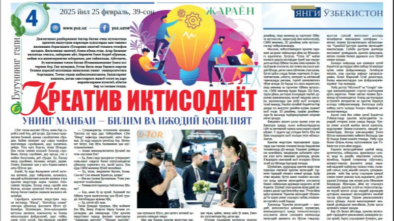 Яқинда “СNN” халқаро нашри томонидан эътироф этилган, ўзбек дастурчилари яратган сунъий интеллект асосида ишлайдиган инновацион платформа — инглиз тилини ўрганувчиларга мўлжалланган “Speaklish”дастури креатив иқтисодиёт намунасидир. Сабаби дастурни яратишда инсоннинг дунёқараши, креатив фикрлаши, инглиз тилини билиш даражаси асос бўлиб хизмат қилади.