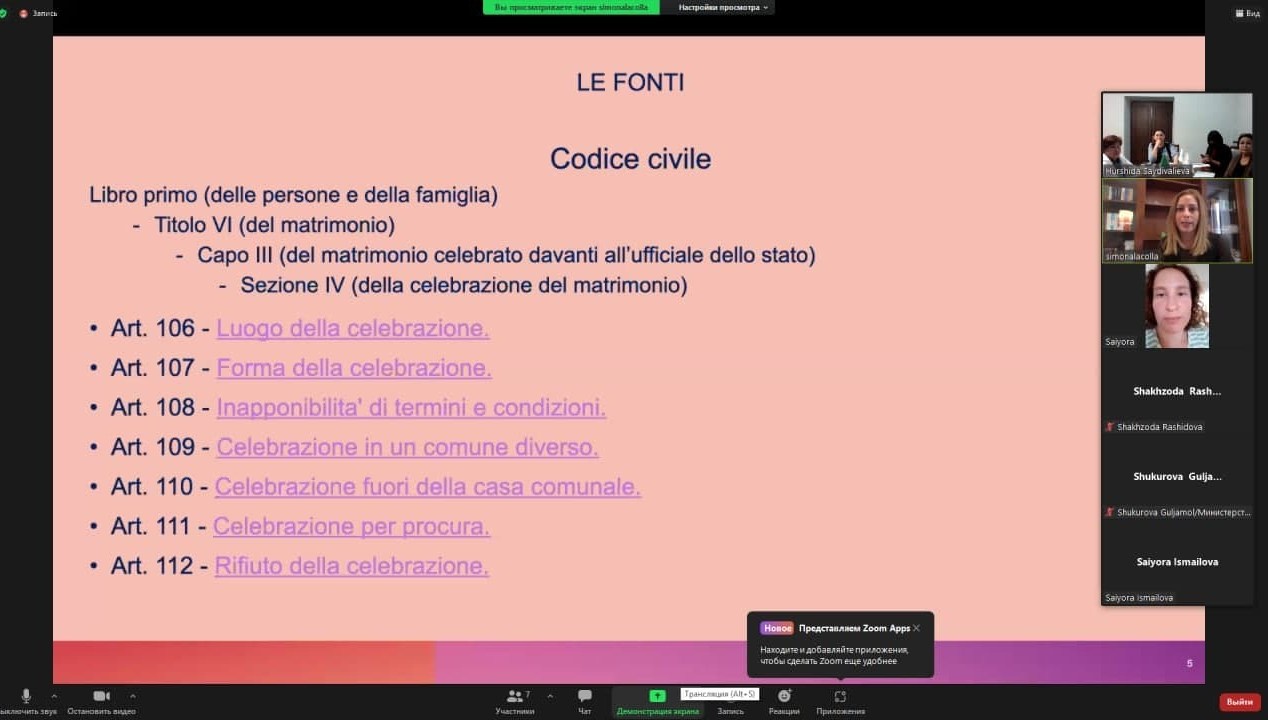 Учрашув институтнинг хорижий илмий-тадқиқот муассасалари билан ҳамкорликни йўлга қўйиш, ўзаро тажриба алмашиш мақсадида онлайн тарзда ўтказилди. Семинарда Италия ҳуқуқий тизими ва суд ҳуқуқ амалиёти билан танишиш, уларда тузилаётган никоҳ шартномаларининг мазмуни ва амалиёти, никоҳдан ажралиш тартиби ва судгача ажрим масалаларини ҳал қилиш, ажрашиш пайтида эр ва хотиннинг мулкий низоларни ҳал этиш тартиби билан танишиш, миллий ҳуқуқий тизимни такомиллаштириш бўйича тавсиялар ишлаб чиқишда давлатлар ўртасидаги тажриба алмашилди.