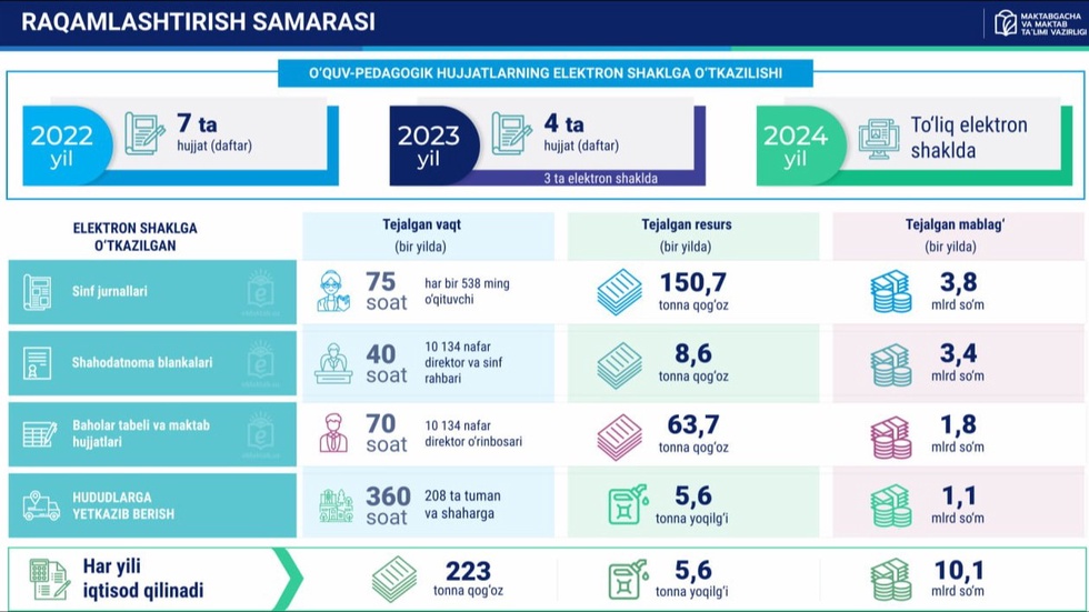 2024-2025-ўқув йилидан бошлаб мактаблардаги ўқув-педагогик ҳужжатлар тўлиқ электрон шаклга ўтказилади.