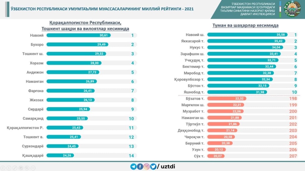 Таълим сифатини назорат қилиш инспекцияси 14 та ҳудуддаги 207 та туман (шаҳар)ларда жойлашган 9622 та мактаблар фаолияти таҳлили натижалари асосида 2020 йил якунлари бўйича умумтаълим муассасаларининг рейтингини ҳамда туман ва шаҳарларнинг таълим сифати бўйича рейтингини эълон қилди.