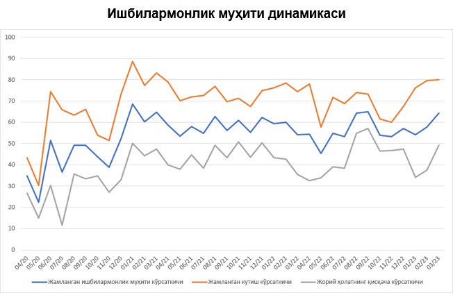 Март ойида ишбилармонлик муҳитининг умумий кўрсаткичи барча тармоқларда ўсди ва энг катта ўсиш иккинчи ой ҳам кетма-кет қишлоқ хўжалигида кузатилди. Агар февраль ойида ишбилармонлик муҳитининг жамланган кўрсаткичи 58 пунктни ташкил этган бўлса, март ойида 6 пунктга кўтарилиб, 64 пунктни ташкил этди ва бу мамлакатдаги ишбилармонлик муҳити ҳолатини ижобий, деб баҳолаш имконини беради.