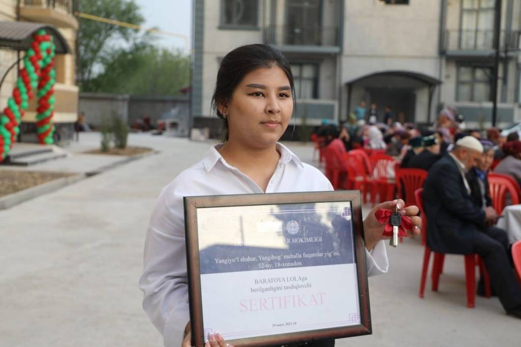 Мутахассисларнинг таъкидлашича, 2022 йилнинг ноябр ойида 18 нафари уйли бўлган бўлса, куни кеча яна “Янгибоғ” маҳалласи ҳудудида қурилган янги кўп қаватли уйларнинг 8 та хонадони Меҳрибонлик уйи тарбияланувчиларига барча қулайликларга эга, жиҳозланган ҳолда тантанали топширилди. Қолган 7 нафари ҳам ўтган йилларда турар-жойлар билан таъминланганди.