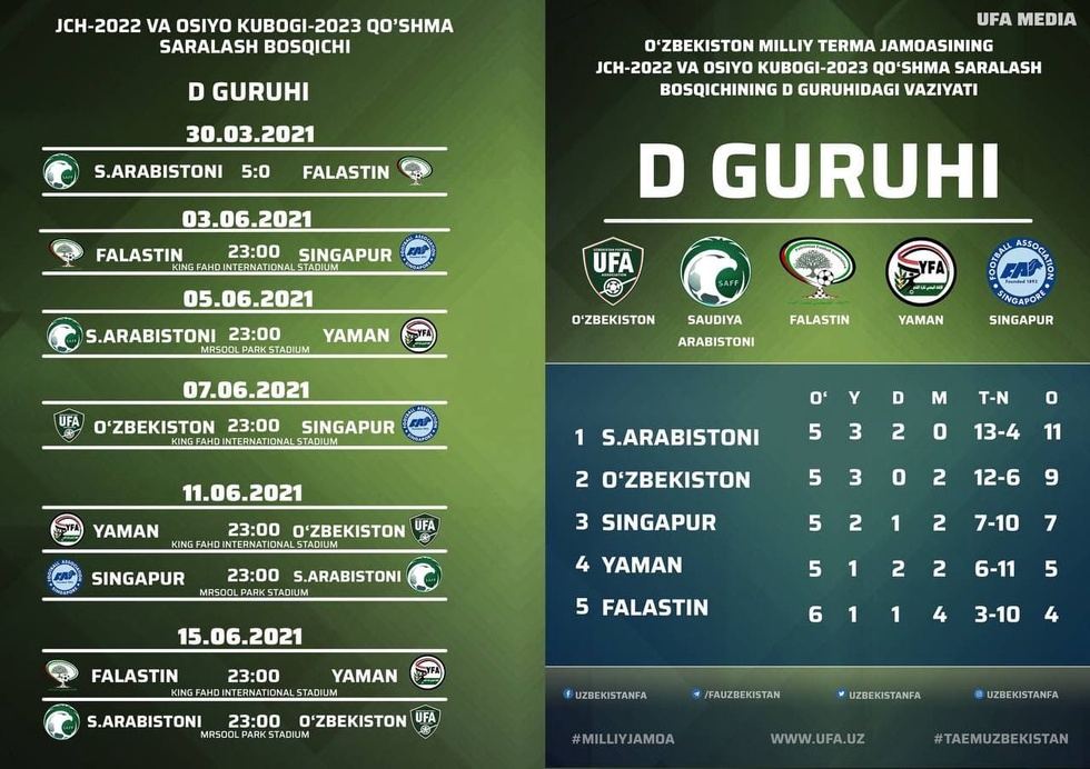 Унда Ўзбекистон миллий терма жамоаси Сингапур, Яман ва Саудия Арабистони терма жамоаларига қарши ўйинларда кейинги босқич йўлланмаси учун кураш олиб боради.