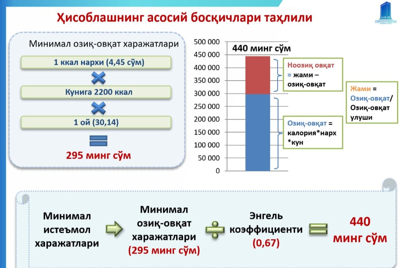 Сўровнома натижасида олинган маълумотлар асосида мазкур оилаларда жон бошига кунлик истеъмол қилинадиган озиқ-овқат (2200 ккал) ва зарур бўлган ноозиқ-овқат товарлар ҳамда хизматлар учун минимал истеъмол харажатлар бир ойда киши бошига (жорий йилдаги нархлар ўзгаришини инобатга олган ҳолда) камида 440 минг сўмни ташкил этиши ҳисоб-китоб қилинди.