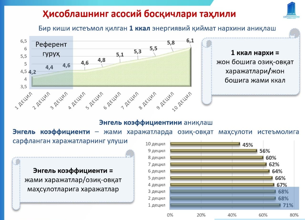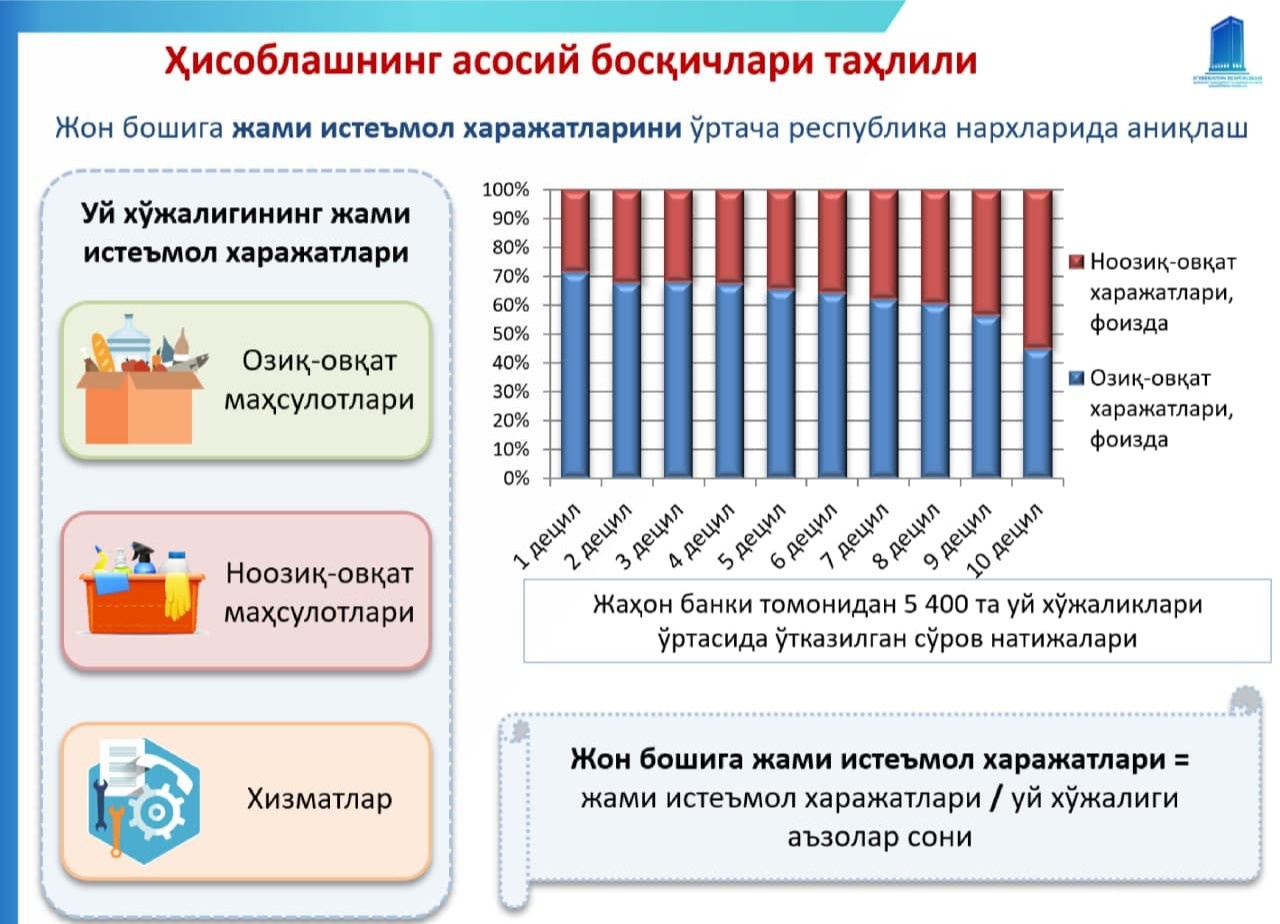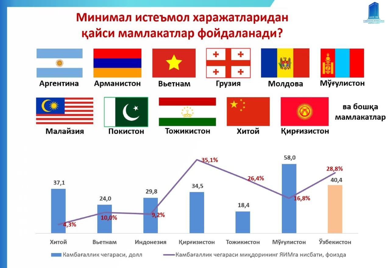 Ҳисобланган минимал истеъмол харажатларининг жон бошига тўғри келадиган ялпи ички маҳсулотга нисбати (ЯИМ) 26,8 фоиз бўлиб, мазкур кўрсаткич ривожланаётган мамлакатларда асосан 4-20 фоизни ташкил этади».