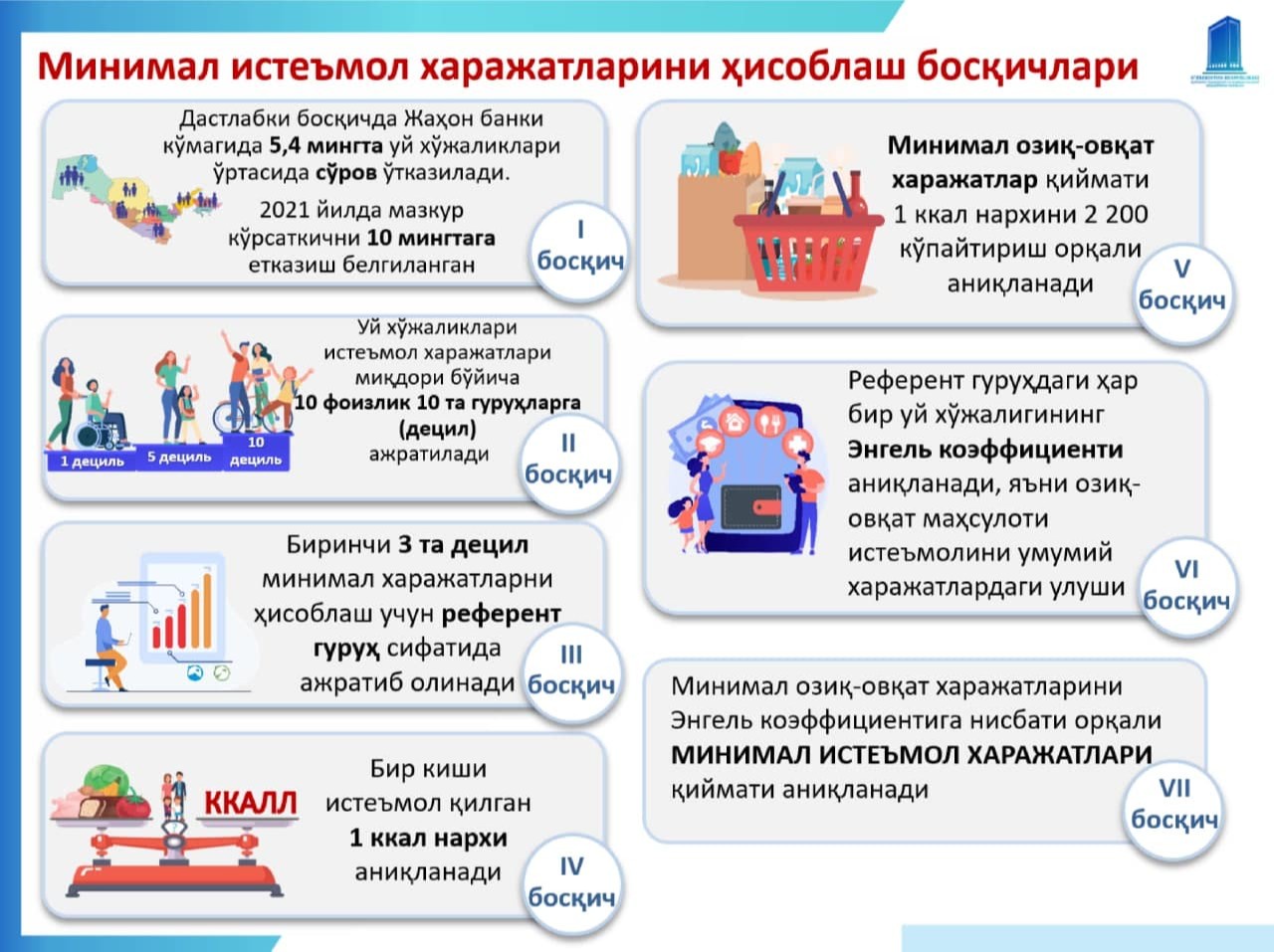 Ушбу мақсадлардан келиб чиқиб, минимал истеъмол харажатларини ҳисоблаш учун тажриба сифатида Жаҳон банки кўмагида 2020 йилда республиканинг барча ҳудудларидан танлаб олинган 5 400 та уй хўжаликларида сўровнома ўтказилди.