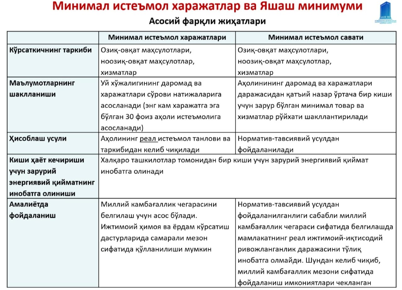 «Минимал истеъмол харажатлари қийматини ҳисоблашда: