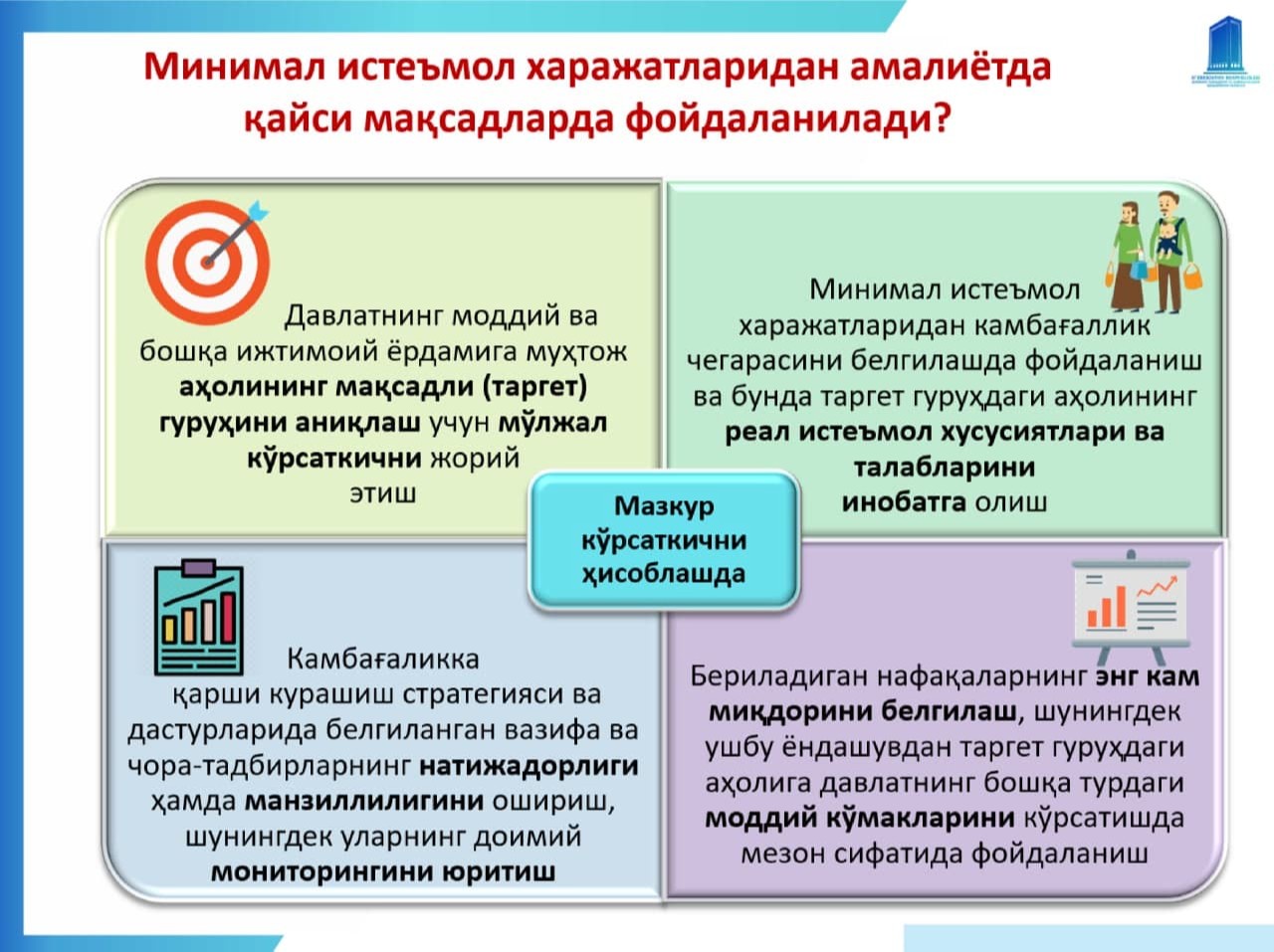 минимал истеъмол харажатларидан камбағаллик чегарасини белгилашда фойдаланиш ва бунда таргет гуруҳдаги аҳолининг реал истеъмол хусусиятлари ва талабларини инобатга олиш;