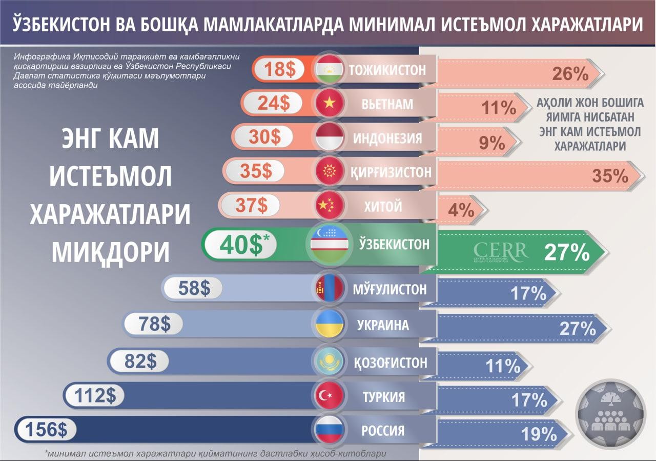 Кўрсаткич халқаро миқёсда ҳам солиштириб кўрилди. Юртимизда ҳисобланган минимал истеъмол харажатларининг жон бошига тўғри келадиган ялпи ички маҳсулотга нисбати (ЯИМ) 26,8 фоиз бўлиб, мазкур рақам ривожланаётган мамлакатларда асосан 4-20 фоизни ташкил этади. Таққослаш учун Россияда бу кўрсаткич 19 фоиз, Туркияда 17 фоиз, Қозоғистонда 11 фоиз. Демак, бизда нисбат юқори хисобланган. Буни Жаҳон банки экспорти Уилям Зейц ҳам алоҳида эътироф этди.
