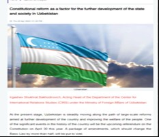 «Ҳозирги босқичда Ўзбекистон мамлакатни янада ривожлантириш, халқ фаровонлигини юксалтиришга қаратилган кенг кўламли ислоҳотлар йўлидан ишонч билан бормоқда,- дейилади мақолада. - Жорий йилнинг 30 апрел куни Конституцияни ўзгартириш бойича ўтказиладиган референдум республика тарихидаги муҳим воқеалардан бири бўл иб қолади. Асосий қонунни ярмидан кўпроққа ўзгартириши керак бўлган ўзгартиришларнинг ягона тўплами овоз бериш учун киритилади».