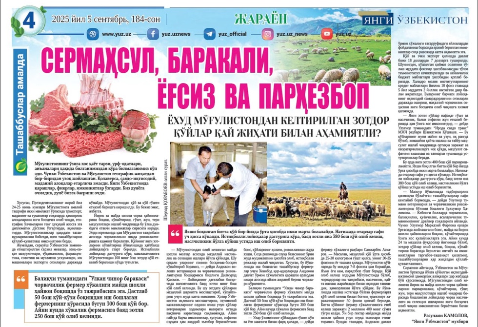 — Янги зотли қўйлар нафақат гўшт ва наслчилик, балки сифатли жун етказиб беришда ҳам ўзига хос имкониятдир, — дейди Улуғнор туманидаги “Ирода савдо транс” МЖЧ раҳбари Шавкатжон Қўшақов. — Бу қўйларнинг жуни майин ва узун, оқ рангда бўлиб, хомашёни қайта ишлаш ва тайёр маҳсулот ишлаб чиқаришда ортиқча харажат ва оворагарчиликларга чек қўяди, маҳсулот сифатини яхшилаш ва таннархи тушишида устуворликлар беради.