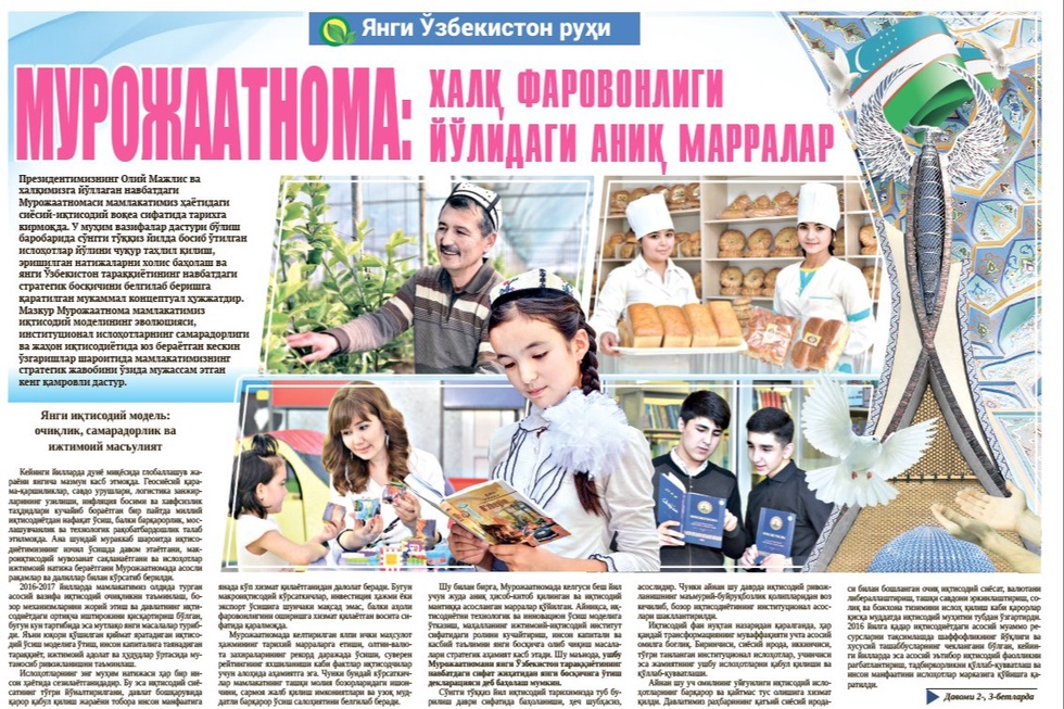 Шу билан бирга, Мурожаатномада келгуси беш йил учун жуда аниқ ҳисоб-китоб қилинган ва иқтисодий мантиққа асосланган марралар қўйилган. Айниқса, иқтисодиётни технологик ва инновацион ўсиш моделига ўтказиш, маҳалланинг ижтимоий-иқтисодий институт сифатидаги ролини кучайтириш, инсон капитали ва касбий таълимни янги босқичга олиб чиқиш масалалари стратегик аҳамият касб этади. Шу маънода, ушбу Мурожаатномани янги Ўзбекистон тараққиётининг навбатдаги сифат жиҳатидан янги босқичига ўтиш декларацияси деб баҳолаш мумкин.