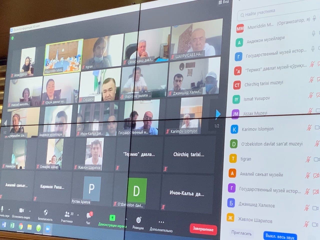 Унда, Тошкент шаҳрида жойлашган музей мутассаддилари, Камолиддин Бекзод номидаги Миллий рассомчилик ва дизайн институтининг “Музейшунослик” факультети мутахассислари якка тартибда, вилоятдаги музей раҳбарлари интернетдаги ZOOM платформаси орқали онлайн иштирок этди. Тадбирни Маданий мерос агентлигининг Илмий кенгаш раиси, санъатшунослик фанлари доктори Камола Акилова олиб борди.