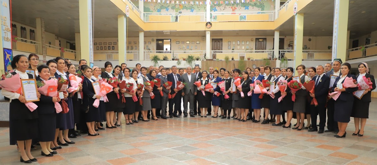Тадбирда вилоят халқ таълими бошқармаси бошлиғи Рустамжон Исроилов, мактаб директорлари ва фаол педагог-ходимлар иштирок этди. Халқ таълими соҳасида ёш авлод камоли ва илм-фан ривожига муносиб ҳисса қўшганлиги, ўтган ўқув йилида намунали фаолият кўрсатган, юқори натижаларга эришган 40 нафар педагог ходимларга “Халқ таълими аълочиси” кўкрак нишони, 29 нафарига Халқ таълими вазирлигининг фахрий ёрлиқлари тантанали равишда берилди.