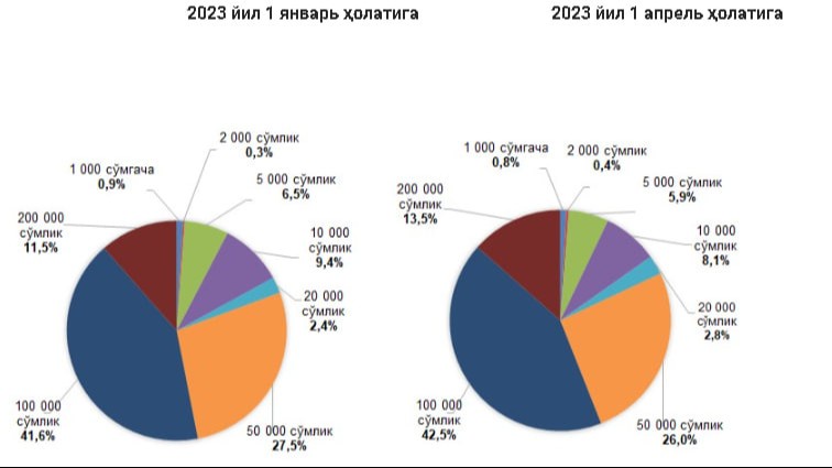 2023 йилнинг I чорагида банк кассаларидан (шу жумладан, банкоматлардан) берилган нақд пуллар 2022 йил январь-март ойларига нисбатан 23,0 фоизга кўпайди ва 86,1 трлн. сўмни ташкил этди.