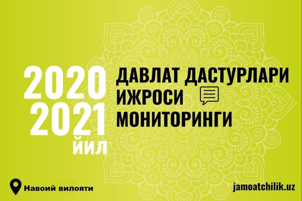 Жамоатчилик назорати тадбирлари давомида Навоий шаҳри, Кармана ва Навбаҳор туманларида “Илм-маърифат ва рақамли иқтисодиётни ривожлантириш” Давлат дастурининг 204, 205-бандлари бўйича белгиланган вазифалар – 2020 йилда оғир турмуш шароитидаги, ногиронлиги бўлган хотин-қизларни арзон уй-жойлар билан таъминлаш, хотин-қизларнинг кичик бизнес лойиҳаларига имтиёзли кредитлар бериш орқали бандлик даражасини ошириш ишлари қай даражада сифатли бажарилганлиги ўрганилади.