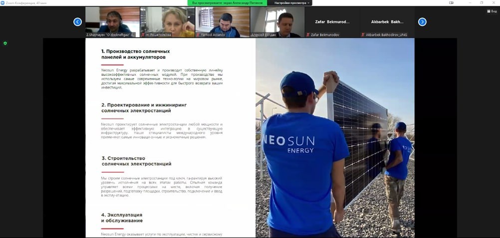 Унда “NEOSUN Energy” компанияси томонидан ишлаб чиқарилаётган маҳсулотлар – қуёш панеллари ва аккумуляторлари ҳамда хизматлари – қуёш электр станцияларини лойиҳалаштириш, қуриш, ишлатиш ва хизмат кўрсатиш бўйича тақдимот ўтказилди.