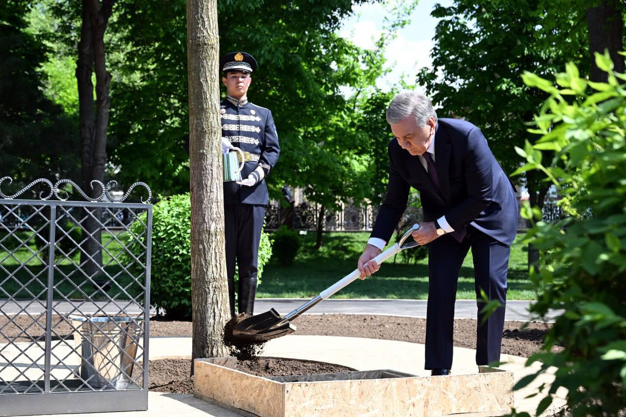 Тадбир якунида Президент Шавкат Мирзиёев хиёбонда кўчат экди.