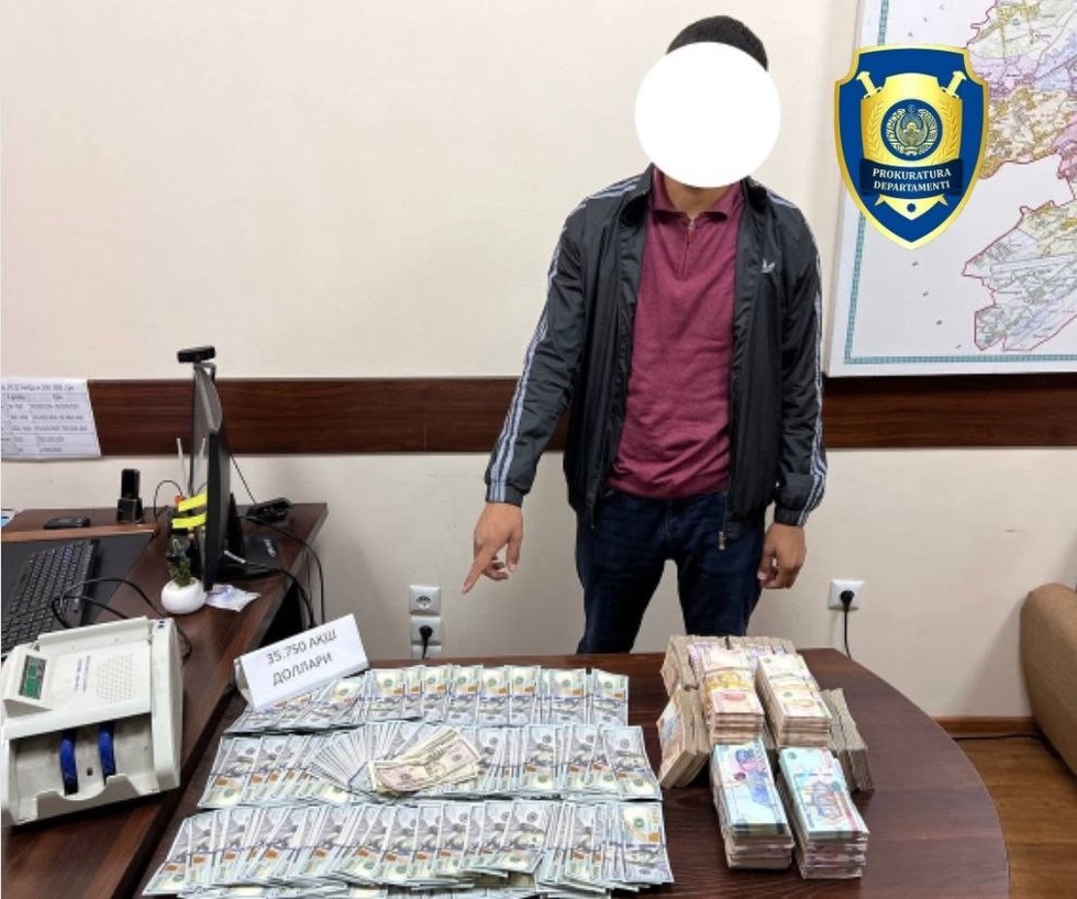 Бош прокуратура ҳузуридаги Департаментнинг Қибрай туман бўлими томонидан ДХХ ходимлари билан ҳамкорликда ўтказилган тезкор тадбирда, фуқаро О.С. (муқаддам ЖКнинг 177-моддаси билан судланган) валюта қимматликларини айирбошлаш фаолияти билан шуғулланиб келиб, фуқаро А.А.га 35 750 АҚШ долларини 409 млн сўмга сотган вақтида ушланиб, тадбир якунида 174 млн сўм, 6 302 АҚШ доллари, 521,5 минг Россия рубли, 270 Евро, 12 минг Қозоқ тенгеси ва 25 дирхам ашёвий далил сифатида олинган.