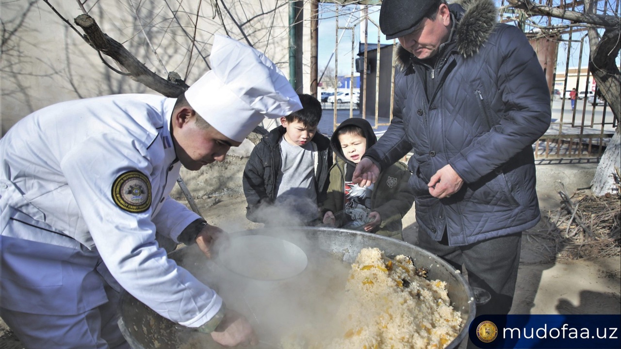 Жумладан, Нукус шаҳридаги “Кўскўл-1,3,4”, 21-кичик даҳа, “Чимбой гузари”, “Айдин жол”, “Анасой”, “Қизилқум” ва “Жеке терек” маҳаллалари, шунингдек, “Жайҳун-учқудуқ” кўчасида ёйилган 10 та ҳарбий дала ошхонасида кунига 100 килогача палов дамланиб, иссиқ чой ва ширинликлар улашилмоқда.