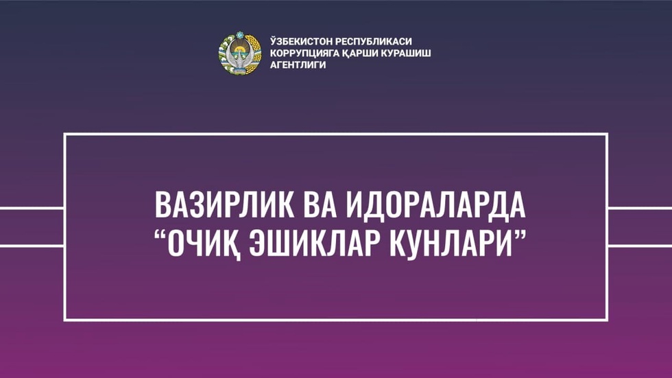 Ҳафталик доирасида бир қатор вазирлик ва идораларда “Очиқ эшиклар кунлари” тадбири ўтказилиши режалаштирилган. Тадбир давлат органлари фаолиятининг очиқлиги, жамоатчилик ва фуқаролар олдида ҳисобдорлигини таъминлаш, улар фаолиятида коррупцияга қарши курашиш масалалари бўйича амалга оширилган ишлар ҳолатини ўрганиш мақсадида ташкил этилади. Тадбир давомида журналист, блогер ҳамда фуқаролар мазкур идоралар масъулларидан ўзларини қизиқтирган саволларга жавоб олишлари мумкин.